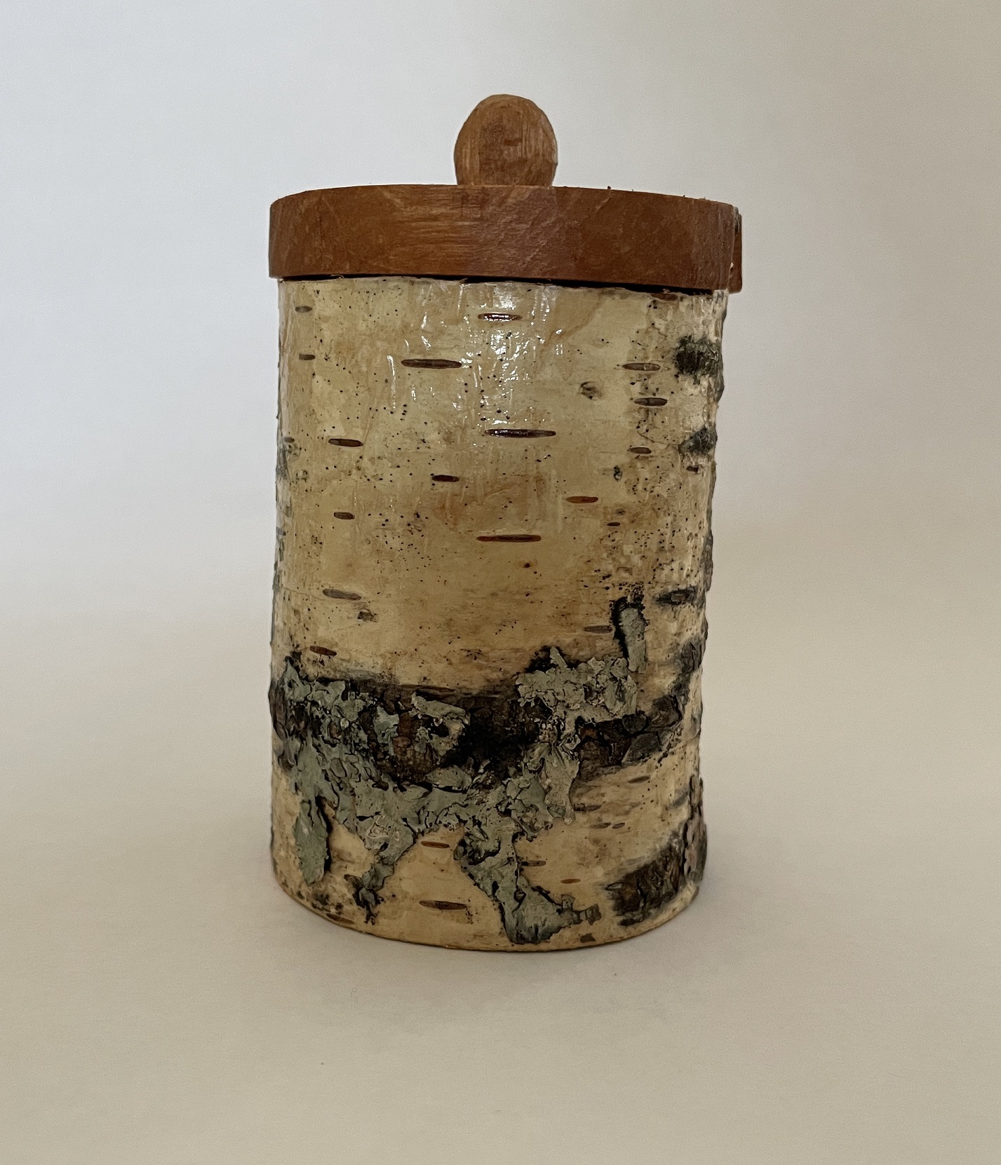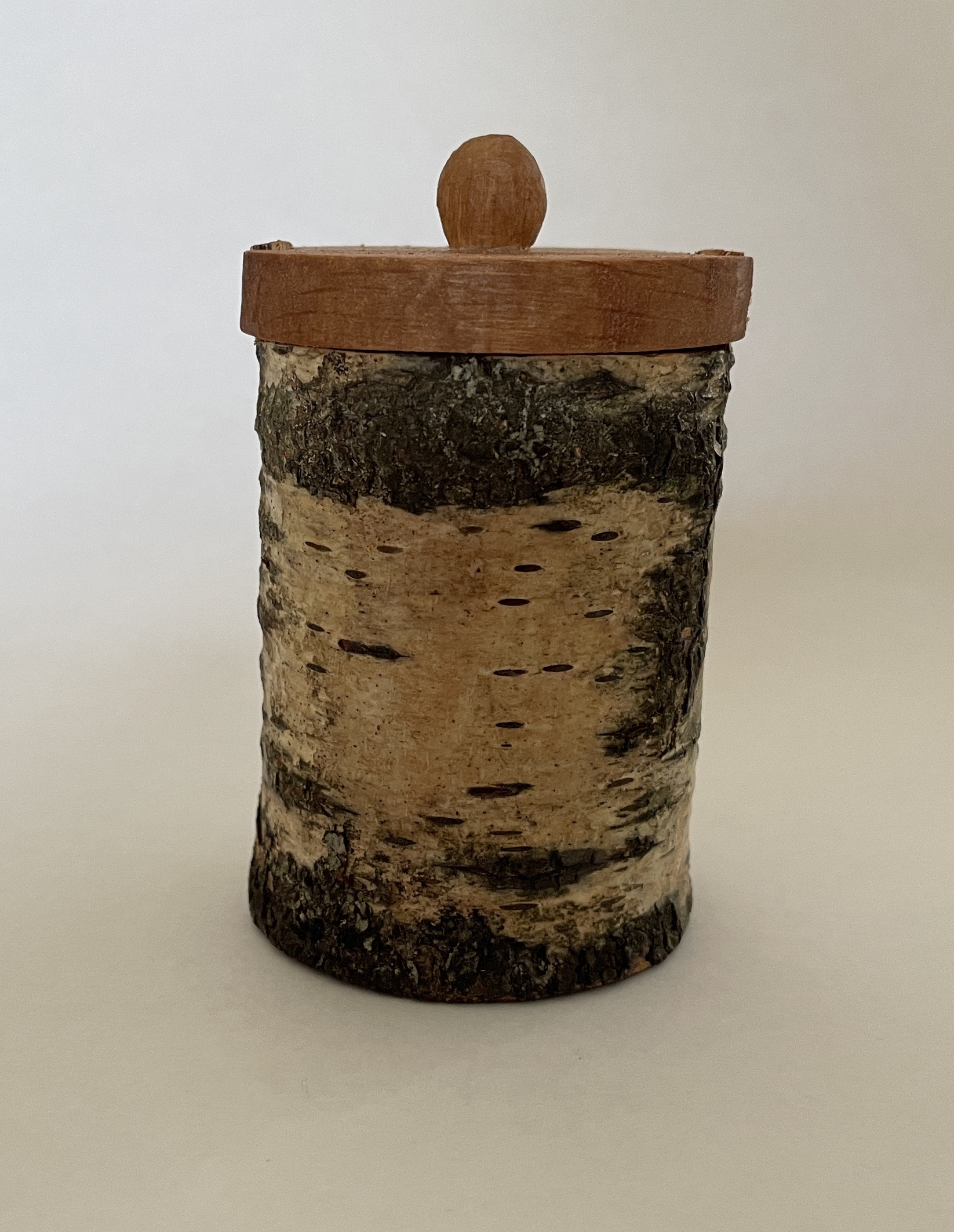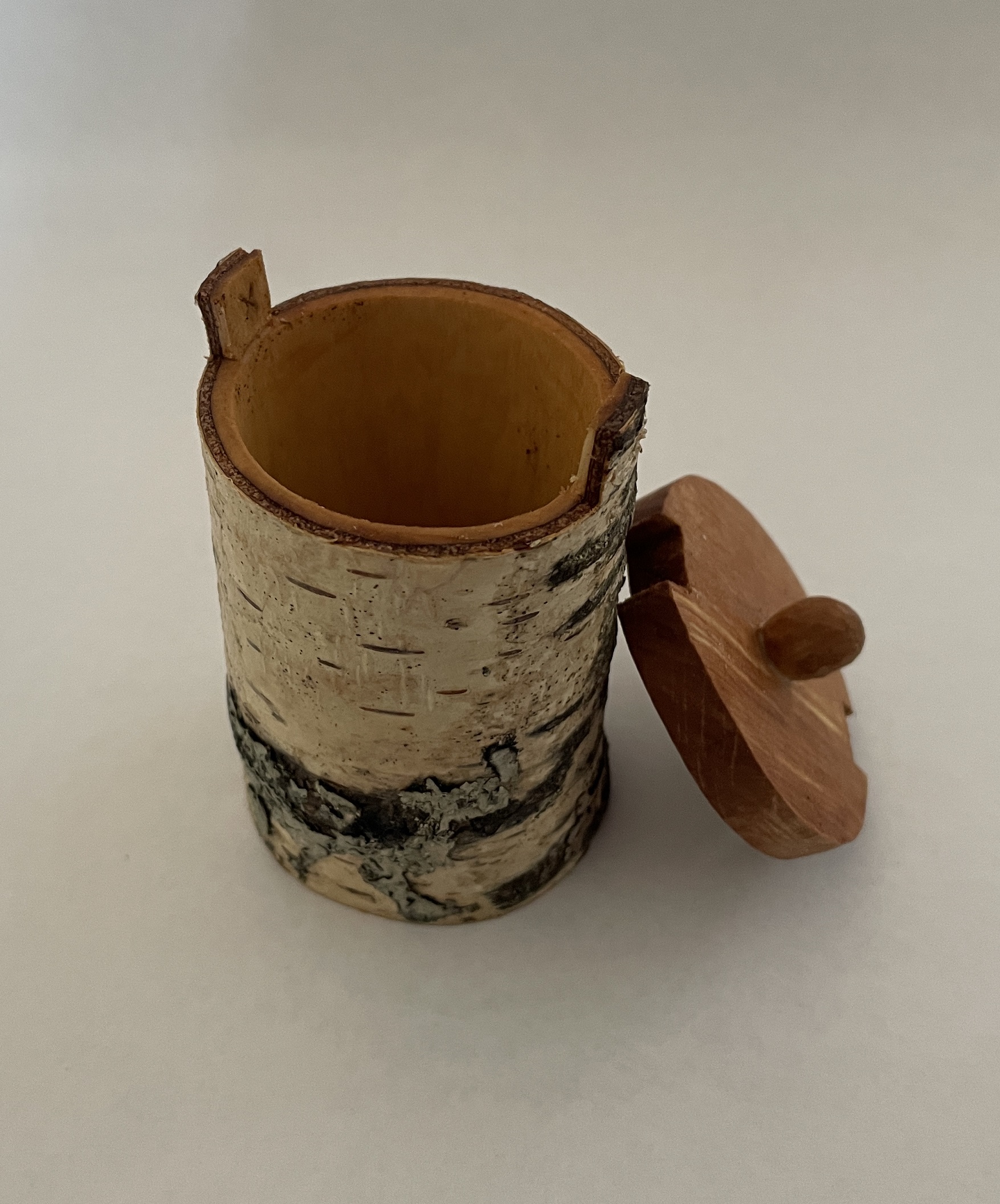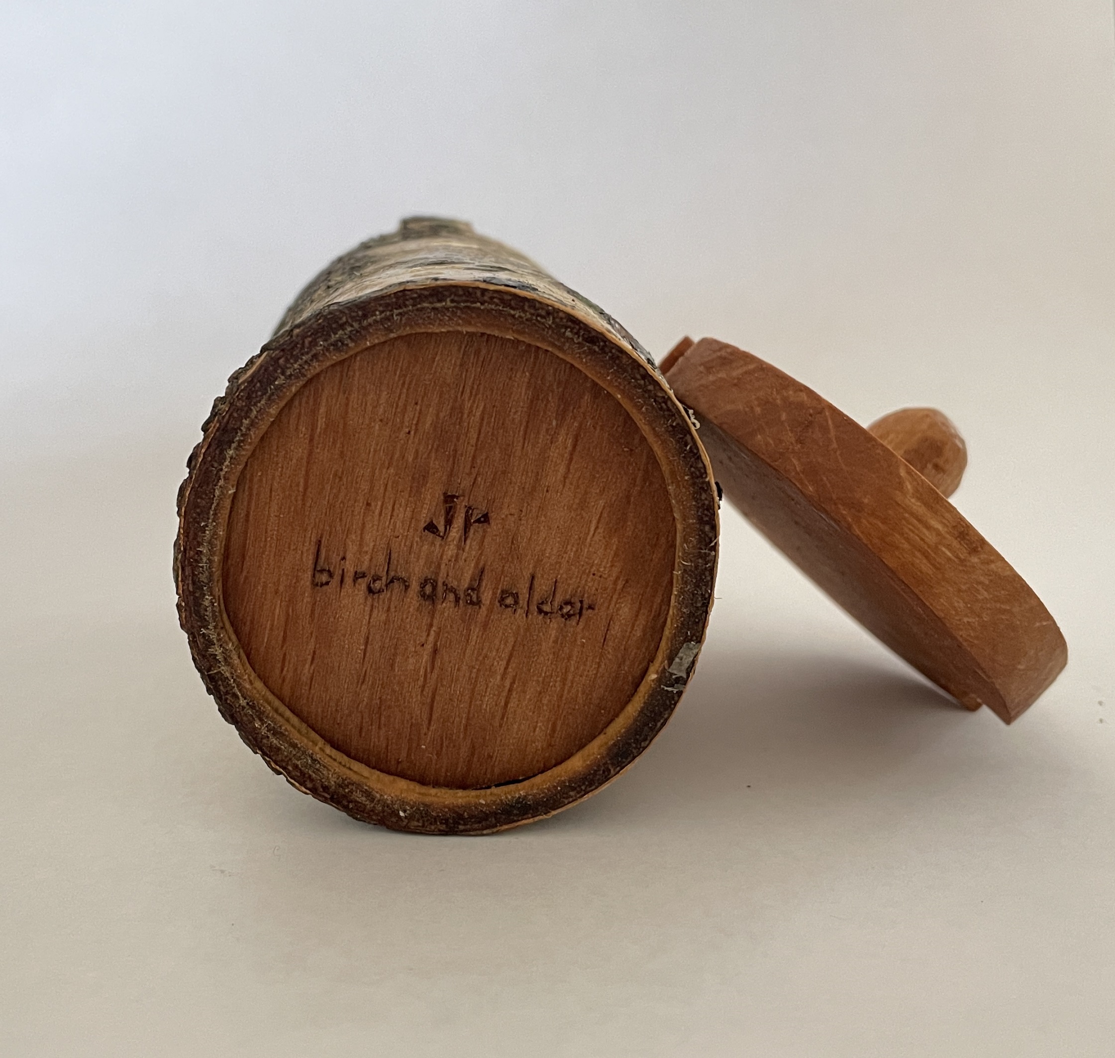 This little shrinkpot is carved from birch that is still green. The base and lid are carved from seasoned alder. The base is carved to a tight fit then left for a few days to allow the body of the pot to dry and shrink and grip the base. The lid is then carved to fit.