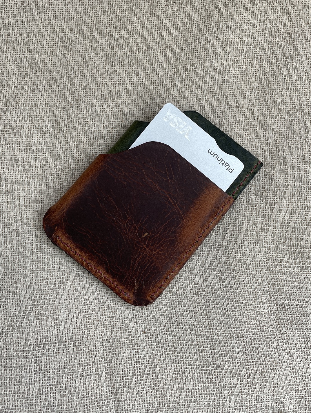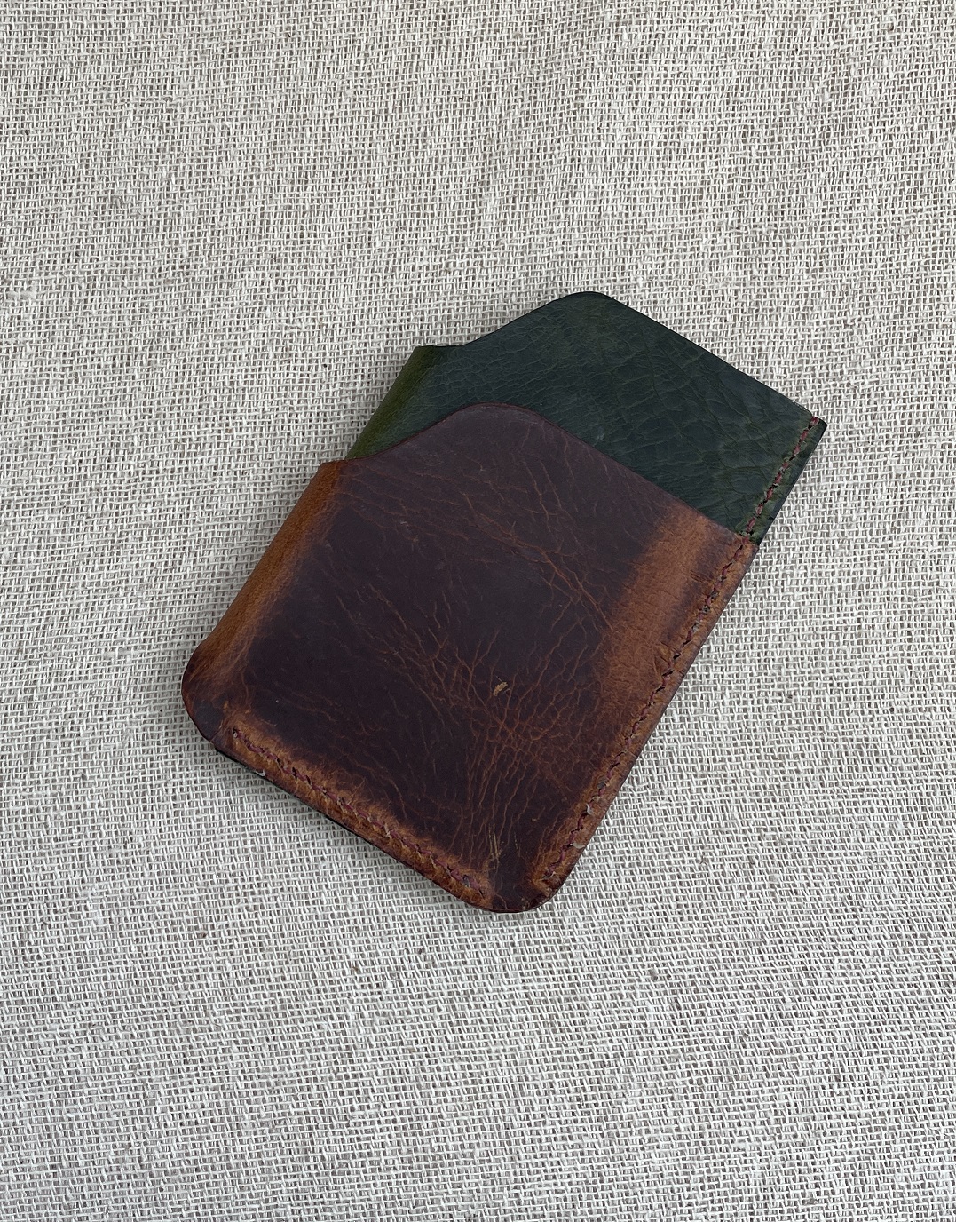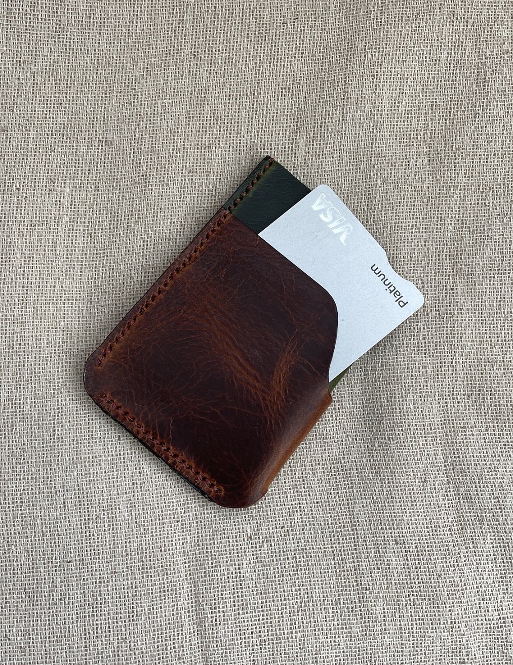 | Ashton. Two pocket card holder. Takes four cards and some folding notes. Olive green and brown leather with brown thread. Hand cut and stitched using choice Italian leather and coloured thread.