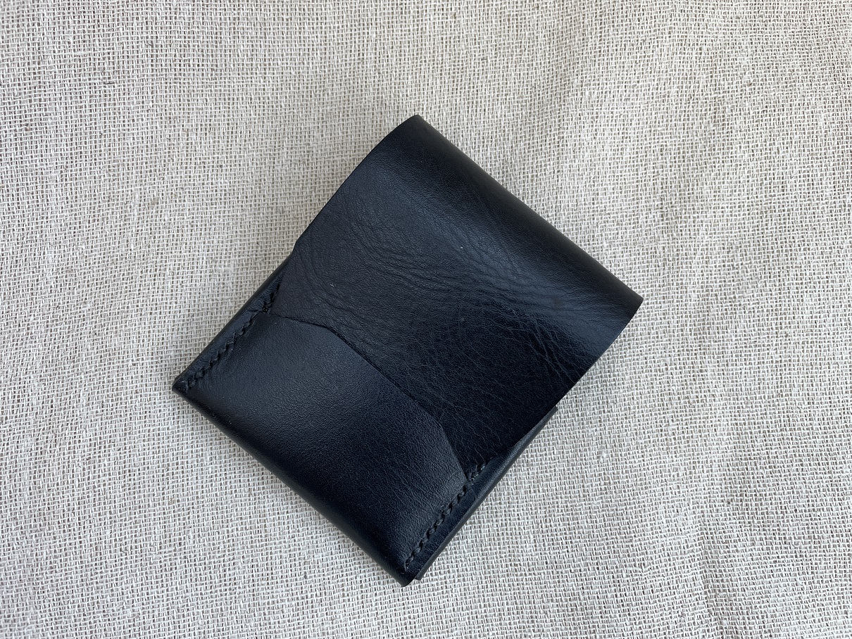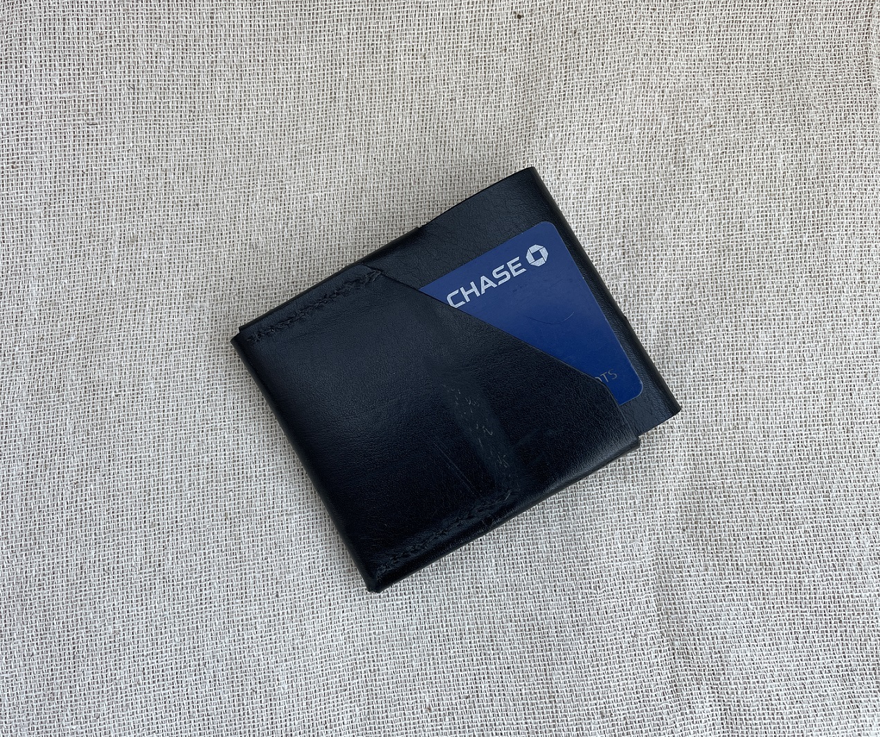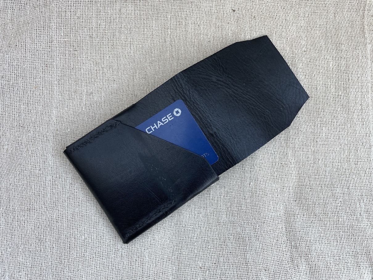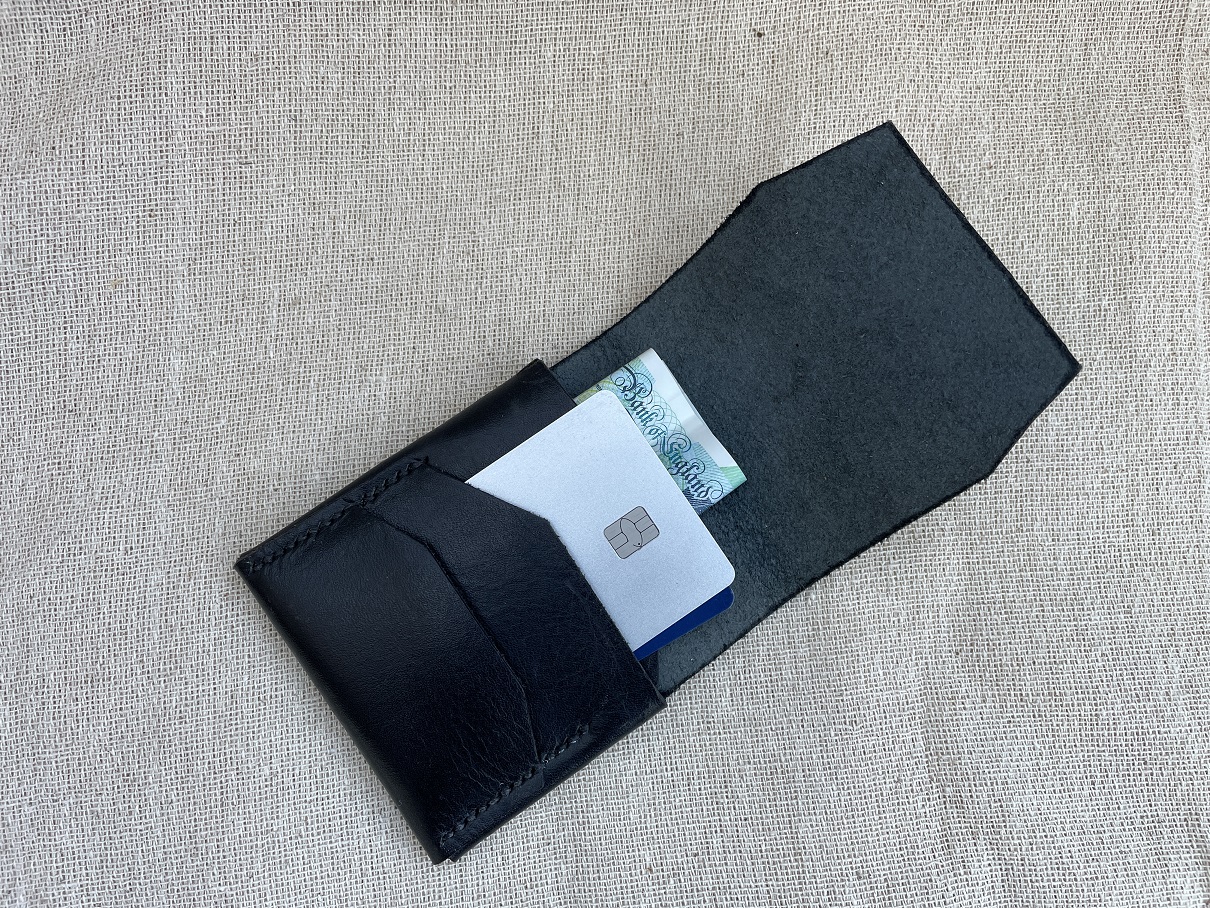 Three pockets for cards and folding notes. Black leather with black thread. Crafted from old leather items that show some wear and tear. Craft: Hand cut and stitched. Material: Repurposed leather. Size folded 100mm x 80mm. Open 190mm x 80mm |