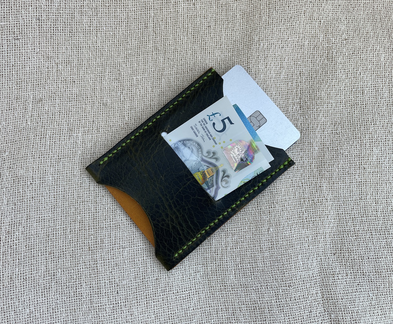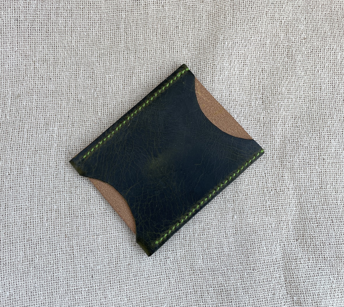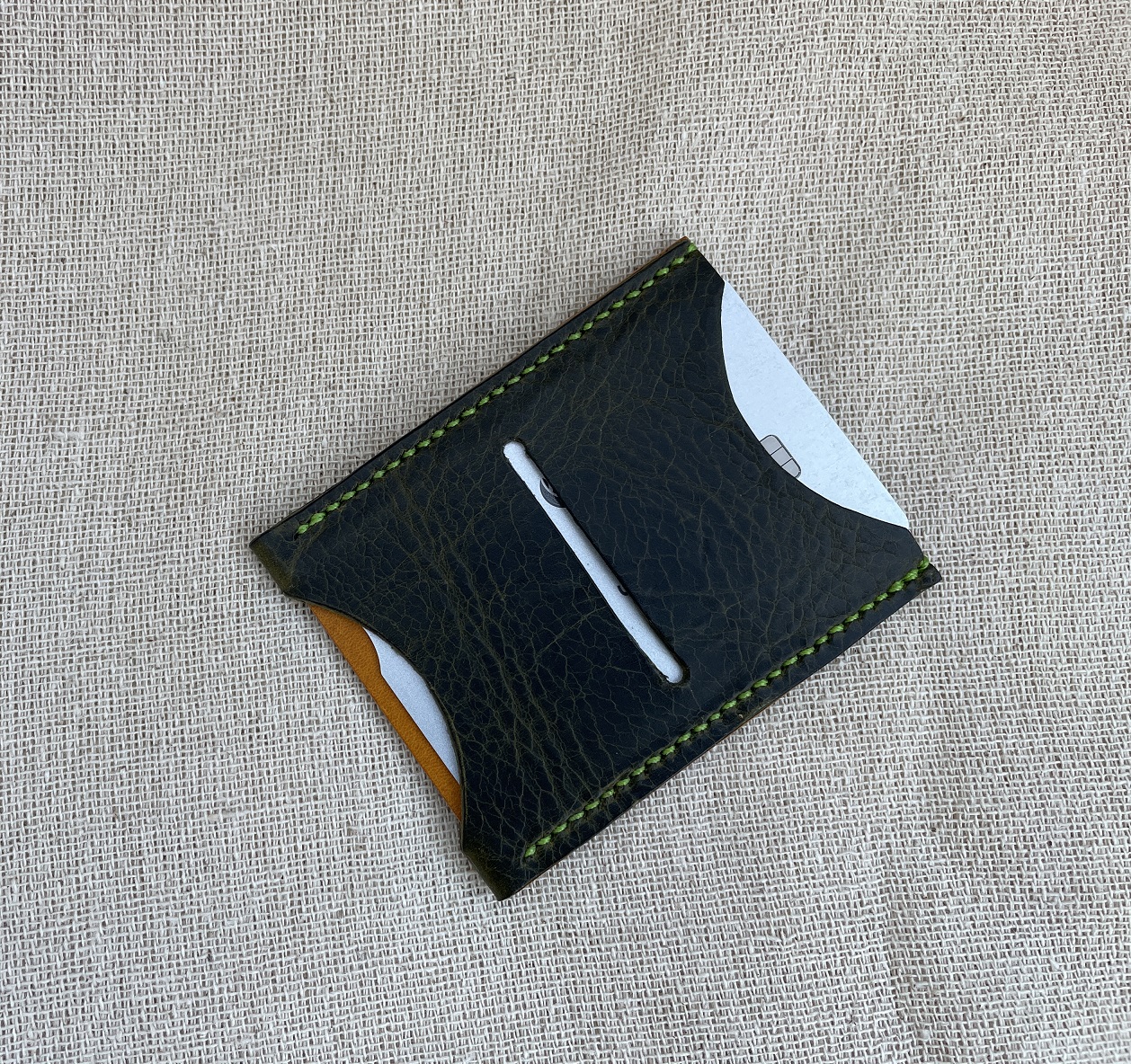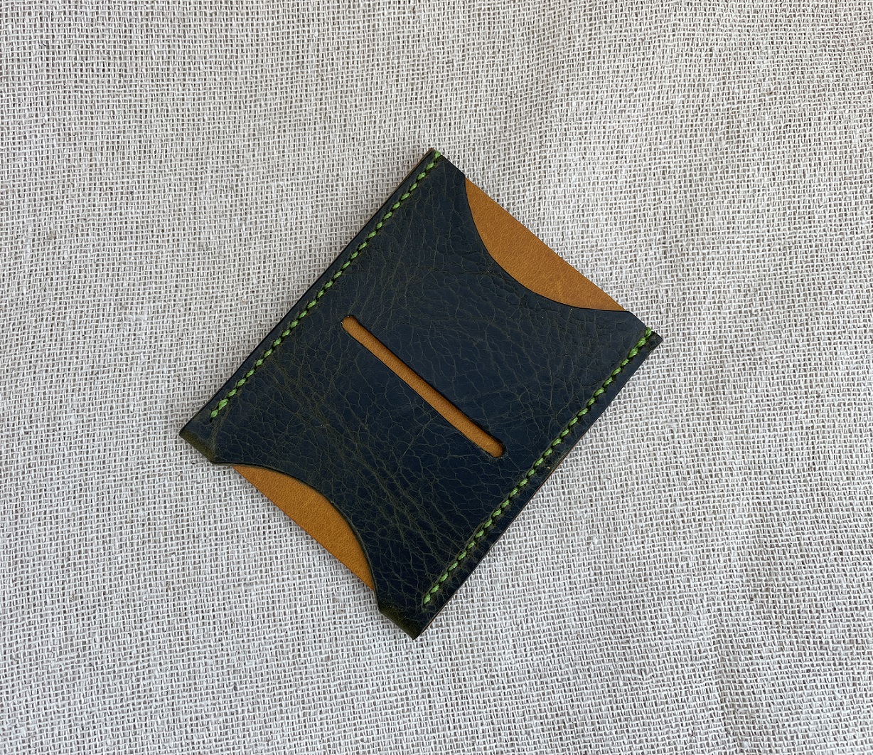 Green and mustard leather with apple green thread.