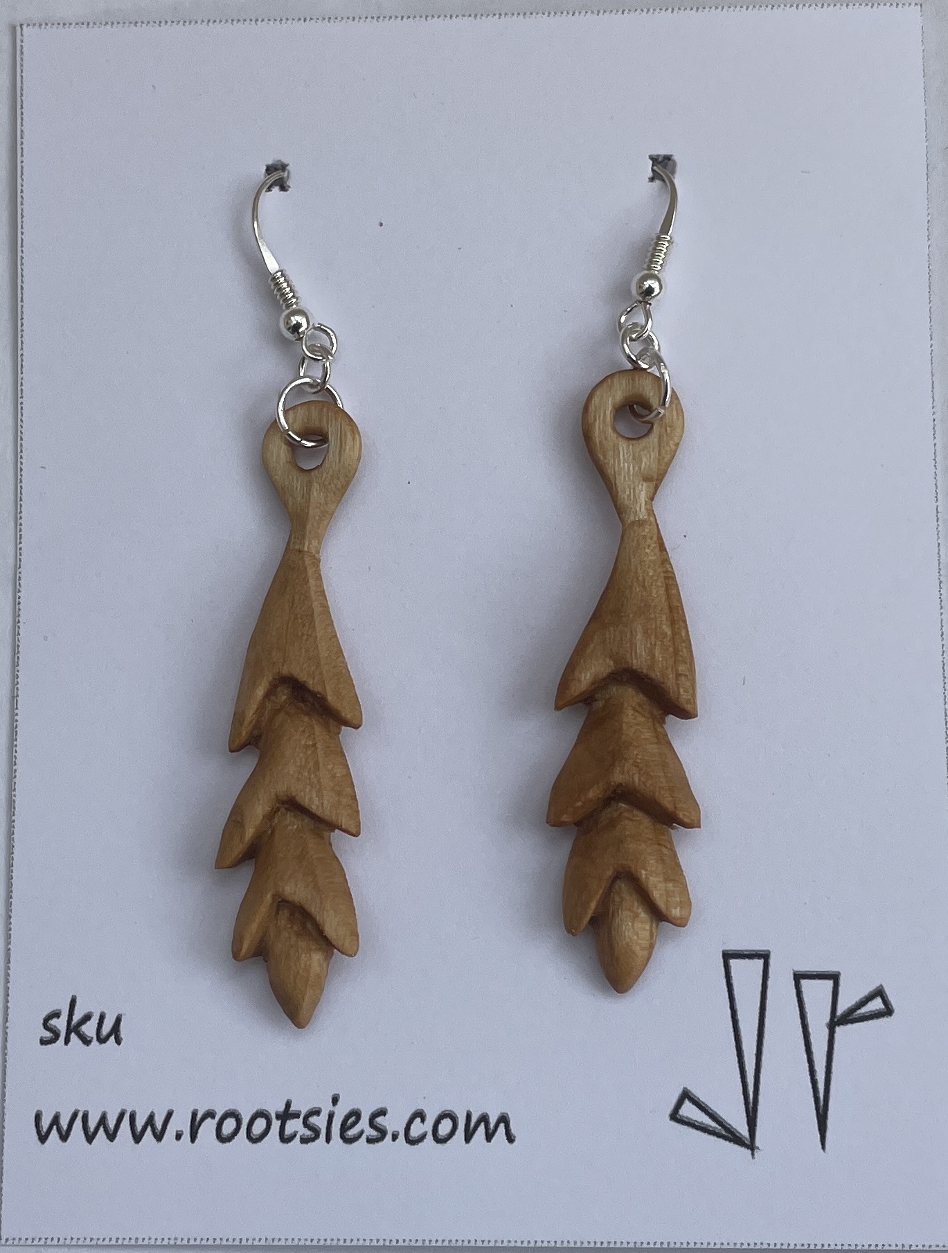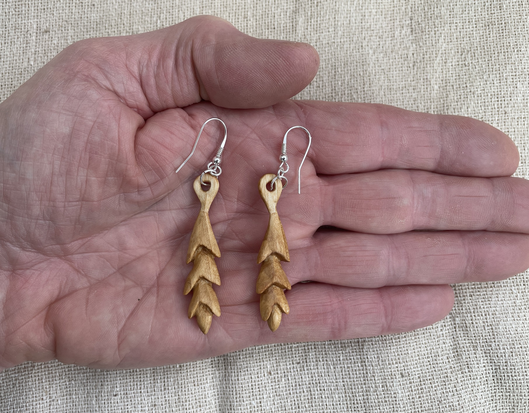The fittings are sterling silver and the hooks 21 gauge, hallmarked 925. Craft: Hand carved. Material: Cherry, sterling silver. Finish: Beeswax polish. Size: Samara design measures 50mm x 12mm x 6mm. Earring drop measures 70mm from hook. |