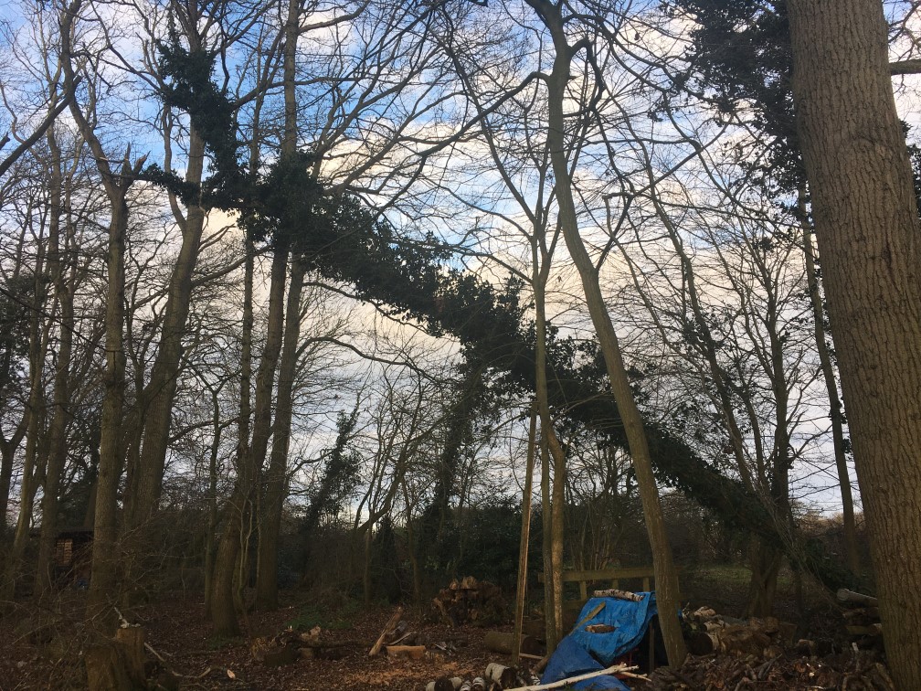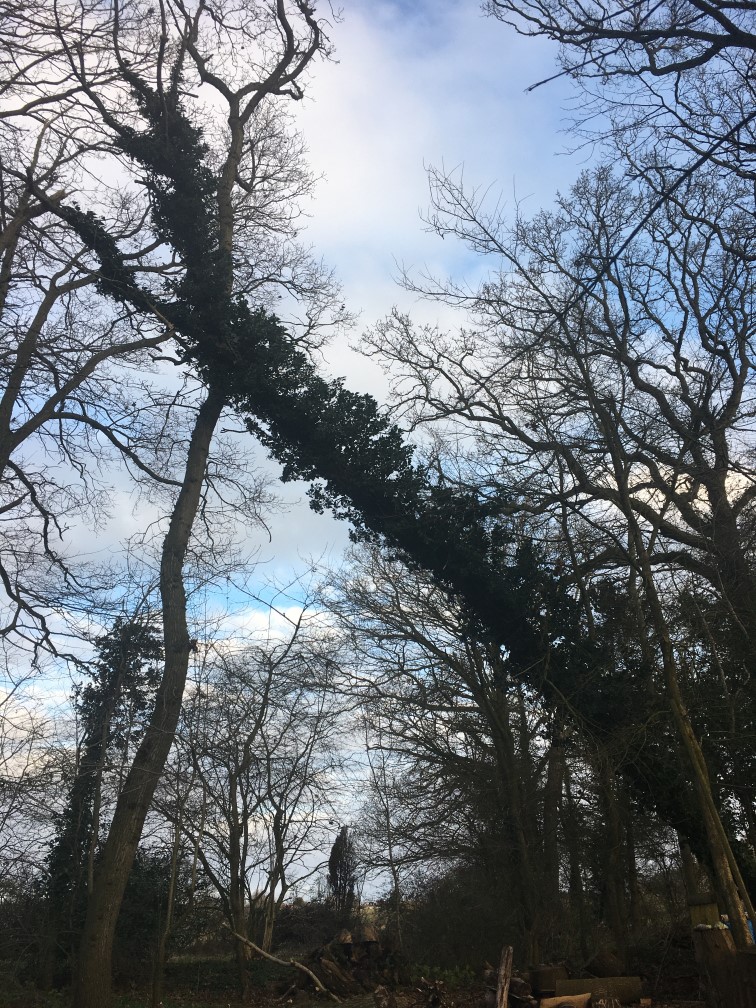 We woke up this morning to an old, ivy covered, ash brought down by the winds overnight. Unfortunately it is well and truly hung up. It is still very windy so if we are lucky it may break free and come all the way down. It is ‘hanging’ over the path so it is very unsafe. Hard hats needed I think.